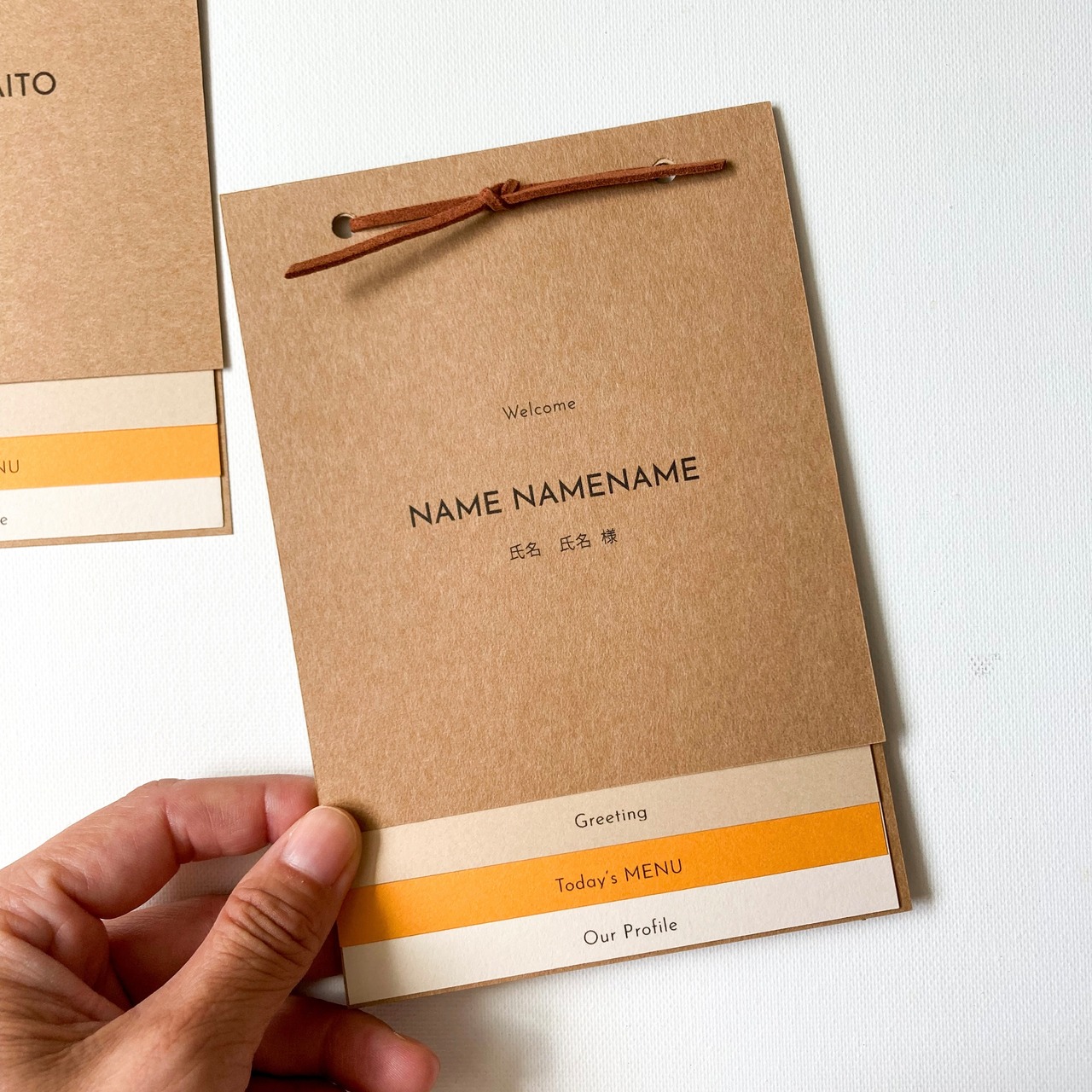 カードを重ねたレイヤードスタイルの席札、メニュー等の一体型デザイン。